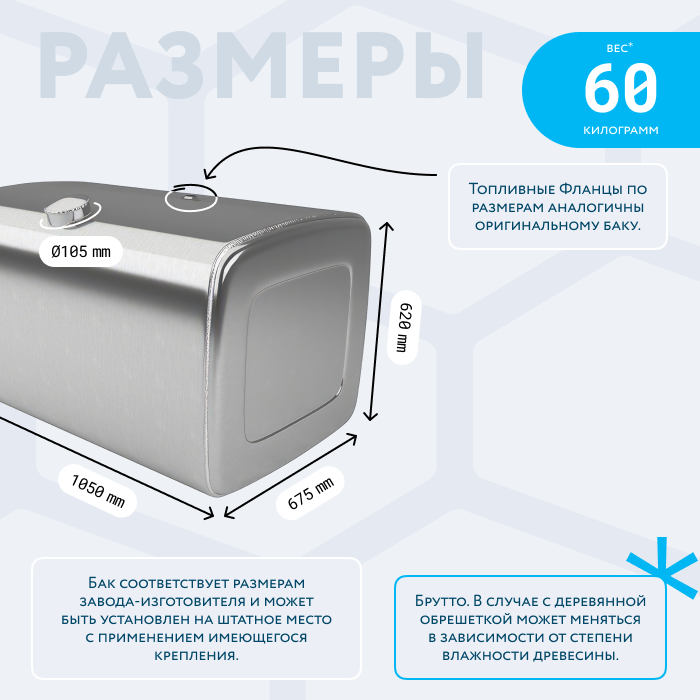 - Так же, если вы приобретаете алюминиевый топливный бак, он будет в деревянной обрешетке (для усиления защиты при транспортировке). При просчете веса и объема, цена за доставку может измениться по факту взвешивания на самом терминале транспортной компании. Так как деревянная обрешетка соответственно изготовлена из древесины, и она имеет свойство значительно набирать вес в зависимости от влажности окружающей среды.