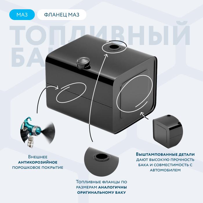 Топливный бак производства БАКОР (аналог 650108-1101010) предназначен для установки на а/м МАЗ (модификации 651669-320 (340), 650119 и 551669).