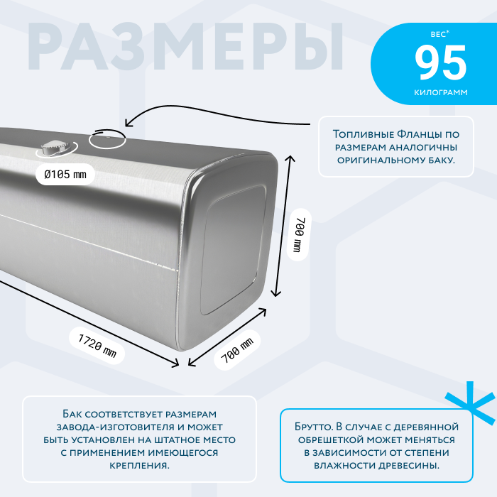 - Так же, если вы приобретаете алюминиевый топливный бак, он будет в деревянной обрешетке (для усиления защиты при транспортировке). При просчете веса и объема, цена за доставку может измениться по факту взвешивания на самом терминале транспортной компании. Так как деревянная обрешетка соответственно изготовлена из древесины, и она имеет свойство значительно набирать вес в зависимости от влажности окружающей среды.